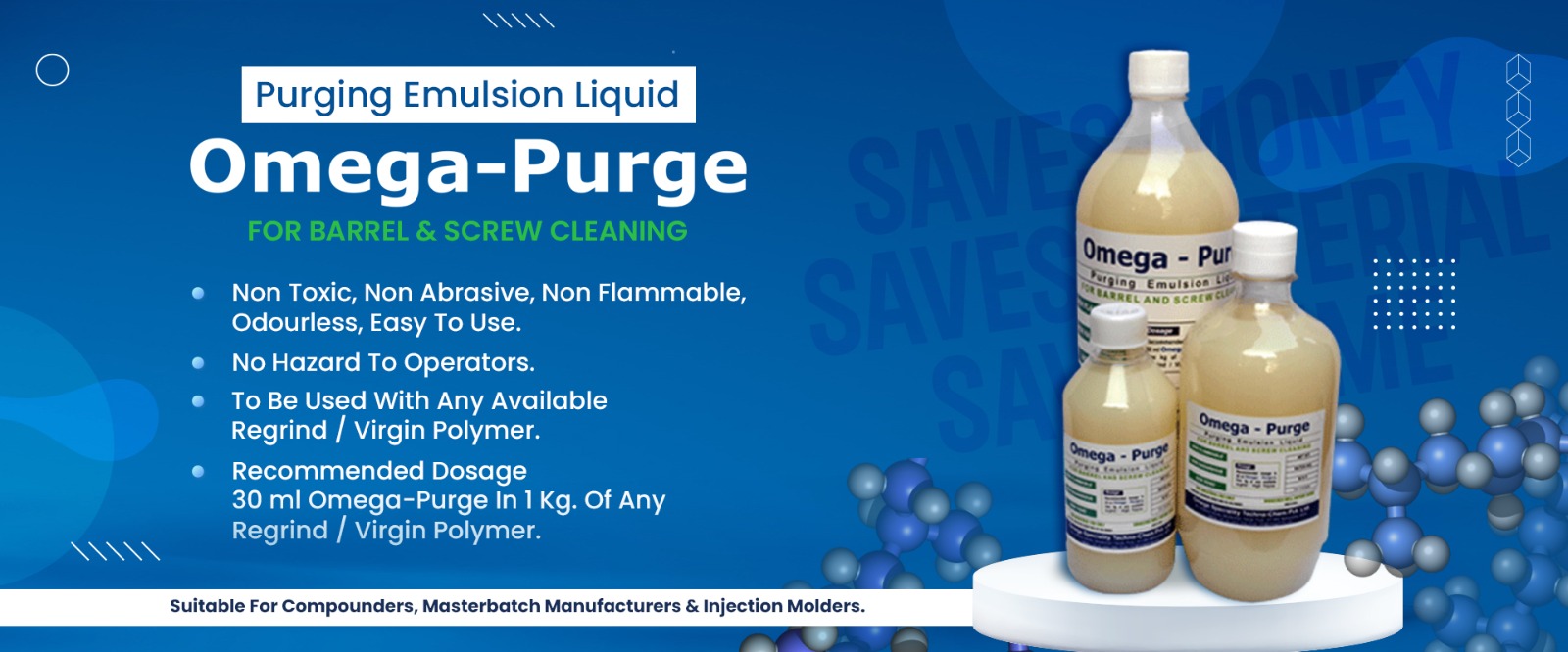 Omega Purge is a purging emulsion liquid for barrel and screw cleaning. This unique formulation is a non-toxic, non-abrasive non-flammable and odourless. This very easy to use solution is cost effective also.